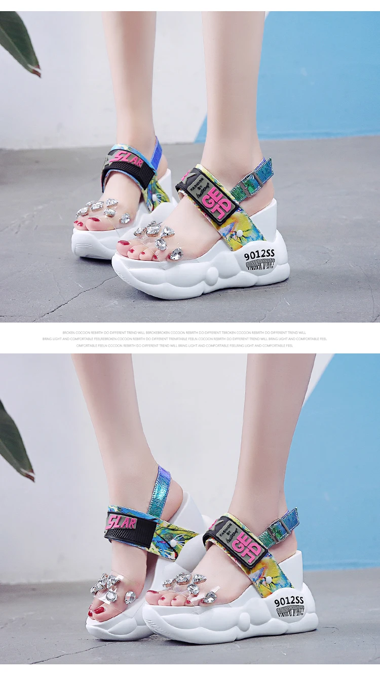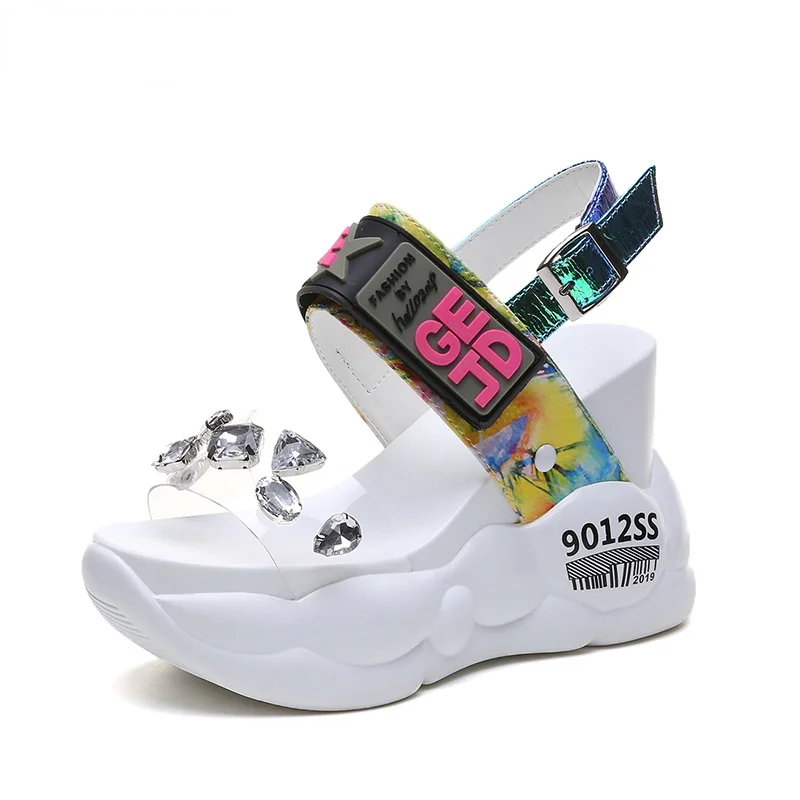Женские босоножки на платформе, белые босоножки на очень высоком массивном каблуке со стразами, лето 2021