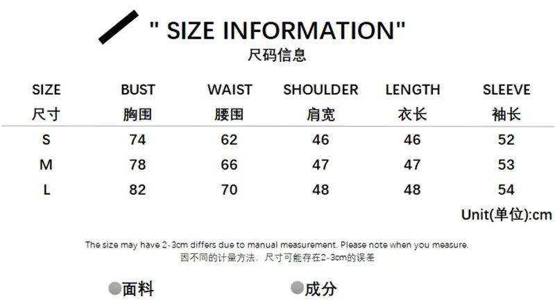 S Обхват груди: 29,13 обхват талии: 24.41 ДЛИНА: 18,11 рукав: 20,47