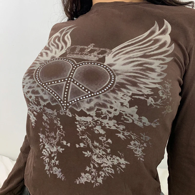 Новинка 2021, винтажная Осенняя женская футболка Y2K с длинным рукавом, привлекательная рубашка с графическим принтом, облегающая блузка, топы, эластичная коричневая одежда