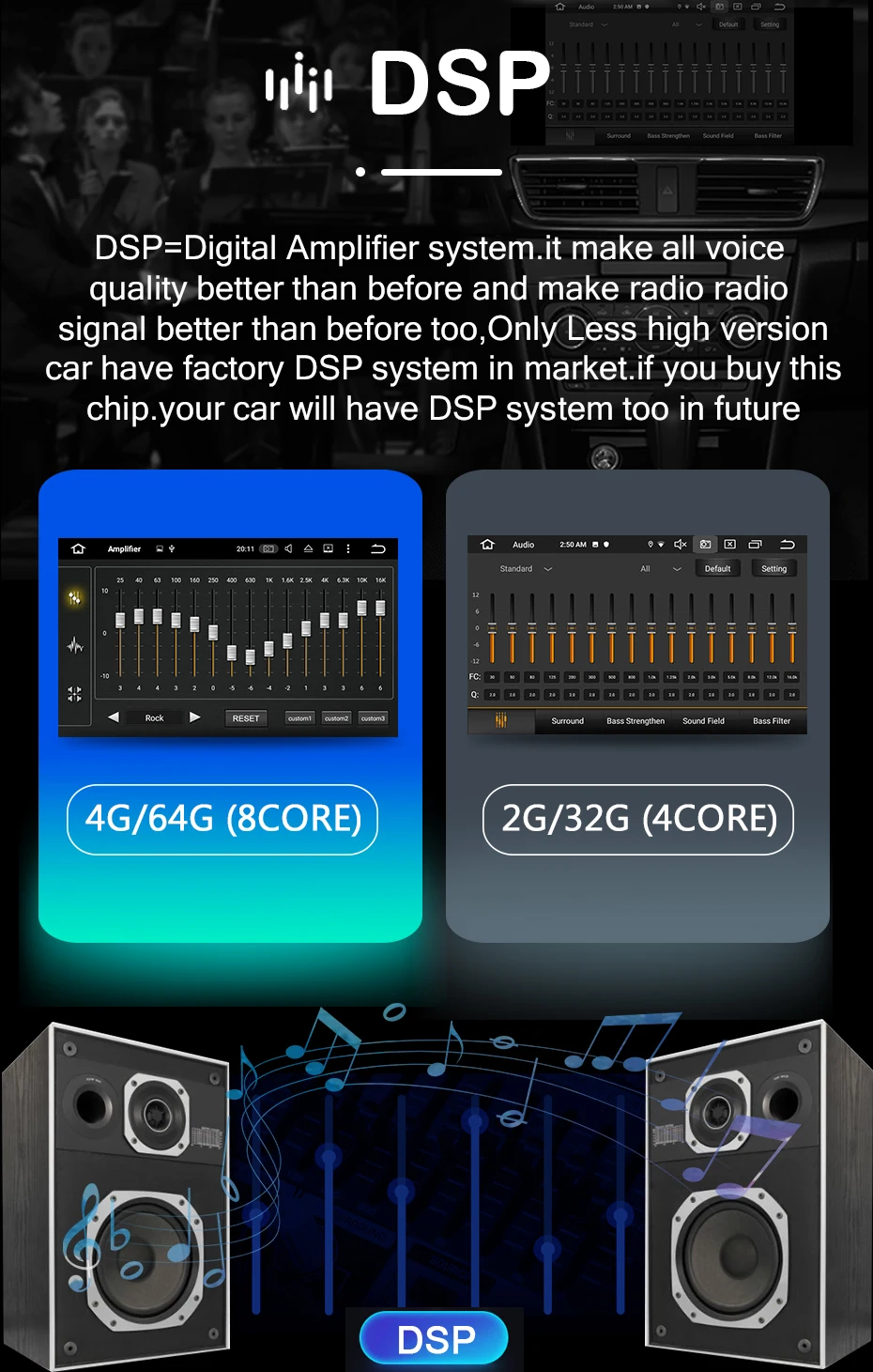 DSPDSP-это цифровая система усилителя, она использует цифровой сигнал, она делает звук автомобиля лучше, чем раньше. PX5 и PX6 DSP-лучший DSP на рынке, пожалуйста, не беспокойтесь о количестве эквалайзера, пожалуйста, чувствуйте наше качество звука px5/px6 радио, это очень хорошо.PX5/PX6 DSP включает много страниц, вы можете задать много параметров, как вы хотите, пожалуйста, смотрите ниже страницы.