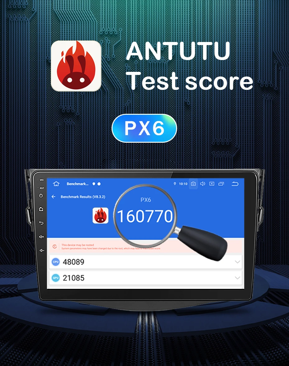 PX6PX6 является лучшим чипом на рынке в настоящее время, он работает быстрее, чем все другие типы. Балл ANTUTU составляет 160770, что лучше 9853 4G + 64G, PX5 и всех других типов 4 + 64G на рынке. По сравнению с другими радио типа fo, PX6 radio может загружать больше видов приложений android с android market, и приложение может работать лучше.