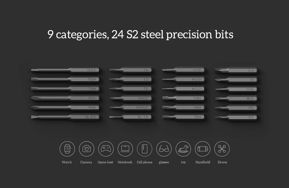 9 категорий, 24 S2 стальные прецизионные Биты24 высокое качество S2 инструмент стальные биты с твердостью до 60HRC *, прочный и прочный. Существует 24 типа прецизионных бит, которые отвечают потребностям основных электронных продуктов и разборки и сборки новых малых приборов.