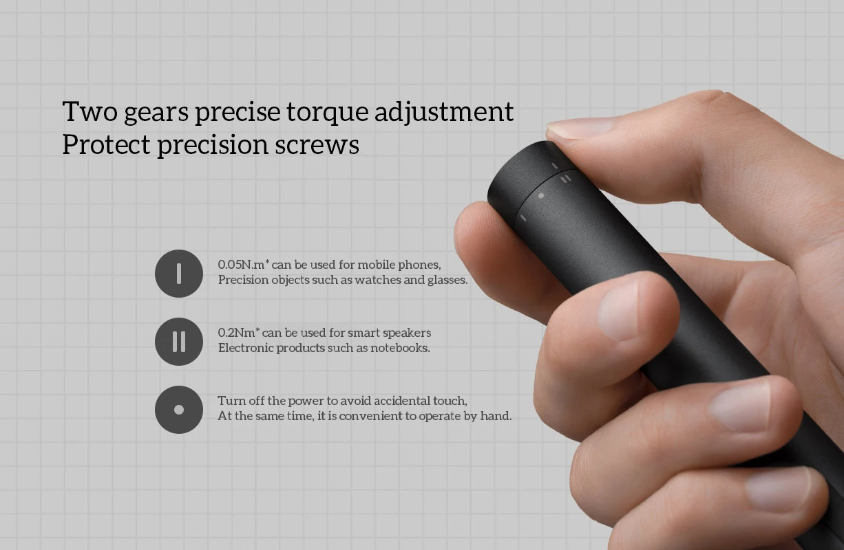 Две шестерни точная регулировка крутящего момента защита прецизионных винтов0.05N.m * Используется для мобильных телефонов, часов, очков и других прецизионных объектов. 0,2нм * может использоваться в электронных продуктах, таких как смарт-динамики и ноутбуки. Выключение питания позволяет избежать случайных касаний и в то же время облегчает операции ручного затягивания.