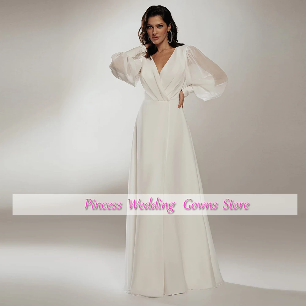Простое белоеслоновое шифоновое свадебное платье с разрезом для невесты, в пол, гражданское свадебное платье, сексуальное женское платье с рукавами-фонариками, свадебное платье