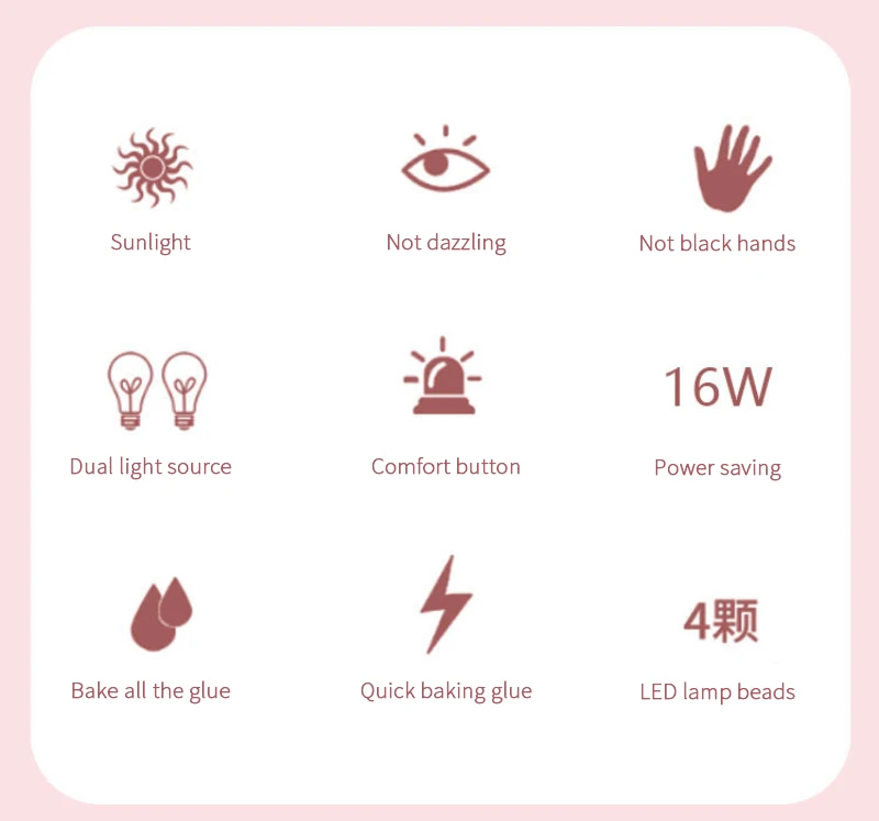 В изделии используются новые улучшенные лампы, которые собираются во всех направлениях при 45 градусах, благодаря чему легко запекать клей для ногтей.
