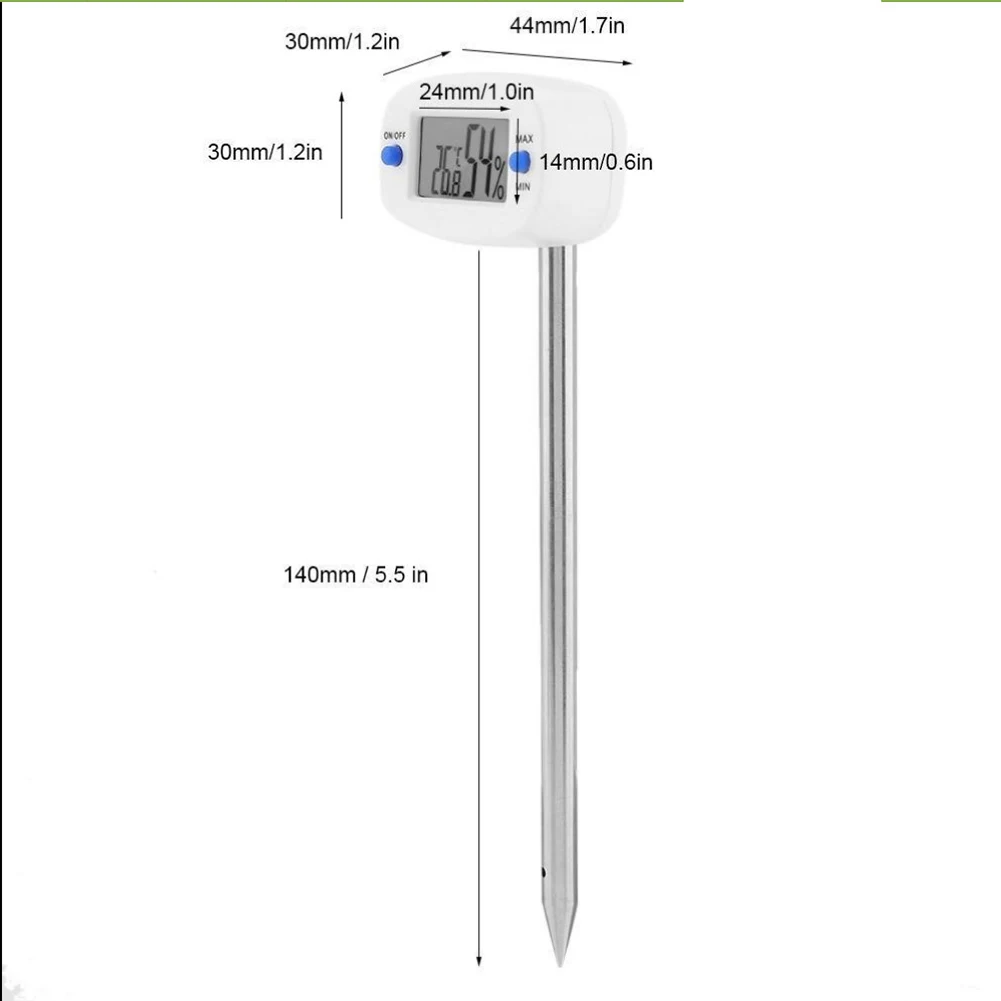 ЖК-дисплей из нержавеющей стали цифровой измеритель почвы зондовый электронный термометр гигрометр Температура Влажность монитор для сада газон растительный горшокХарактеристика:Маленький размер, светильник вес, легко носить с собой и хранить.Операция очень проста, просто вставьте зонд в почву и нажмите клавишу для выполнения теста.ЖК-дисплей показывает четкие цифры с первого взгляда.Вставьте 2/3 глубины почвы (более 10 см/3,94 дюйма), это самые точные данные измерений.Используется для проверки влажности и температуры почвы и обеспечения нормального роста растений.Спецификация:Материал: нержавеющая стальРазмер внешнего вида: 44x30x3 0 мм/1.73x1.18x1.18inРазмер ЖК-дисплея: 24x1 4 мм/0.94x0.55inДиапазон измерения: 0 °C - 50 °CТемпература: 10%-98%Погрешность: ± 1 ℃Точность: 0,1 ℃Диапазон измерения температуры: -9 ℃ - 110 ℃Диапазон измерения влажности: 30% 98%Режим питания: кнопочный Аккумулятор X 1Длина стальной иглы: 140 мм/5,51 дюймаПримечание:В связи с различиями мониторов и эффектами освещения реальный цвет товара может немного отличаться от цвета на фотографиях. Спасибо!Обратите внимание, что допускается отклонение в диапазоне 1–3 см из-за проведения замеров вручную.
