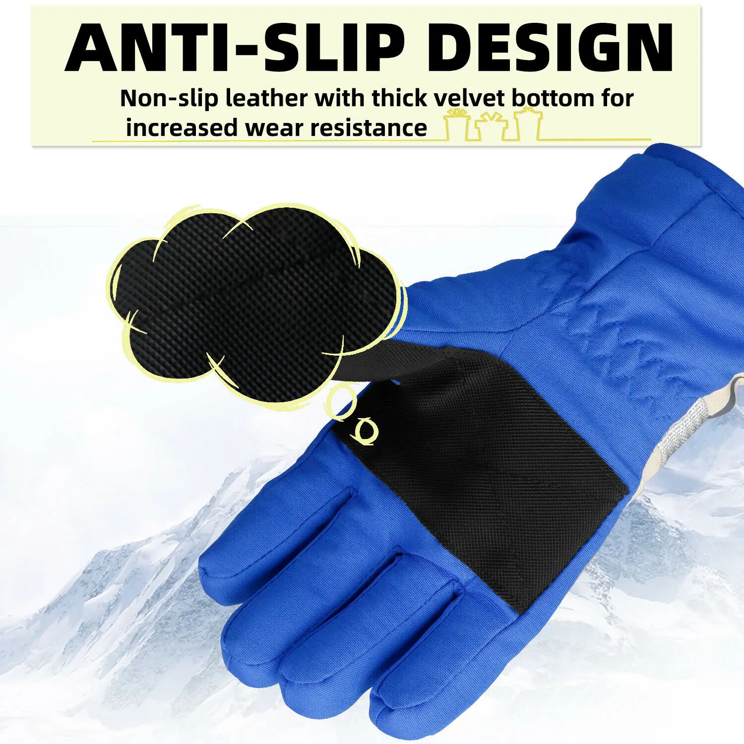 3. Уникальный дизайн: Детские теплые зимние перчатки поставляются с чрезвычайно прочной нескользящей искусственной ладонью, которая усиливает трение, предотвращая скольжение. И вы можете пристегнуть две перчатки вместе, не потеряв пряжку, когда она не используется. Это делает вас более удобным, когда вам нужно найти ее в следующий раз.