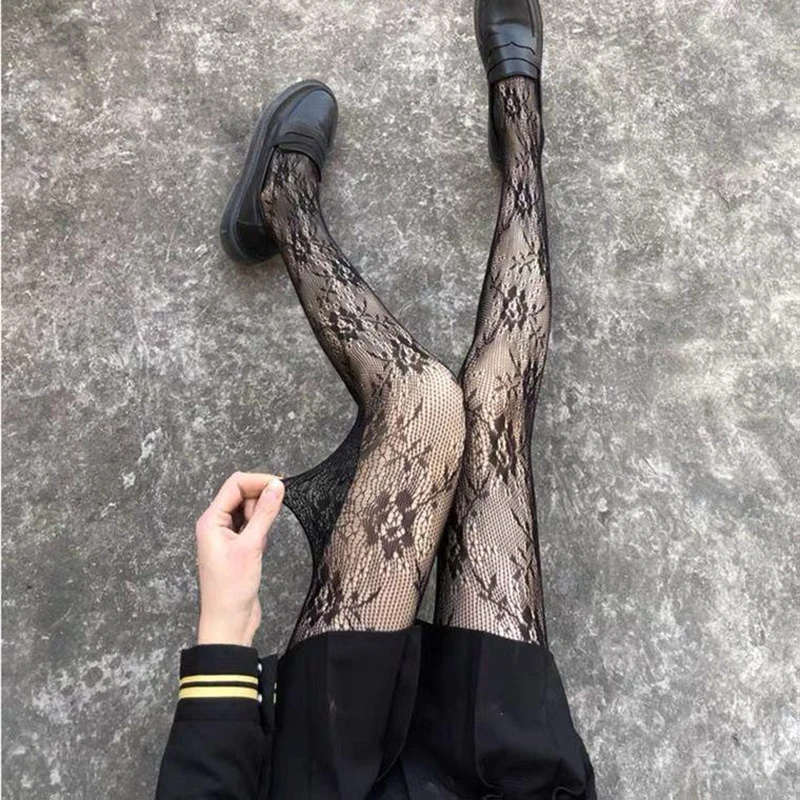 Лолита ажурные Цветочные кружевные колготки однотонные прозрачные винтажные сетчатые колготки в сеточку женские черные колготки