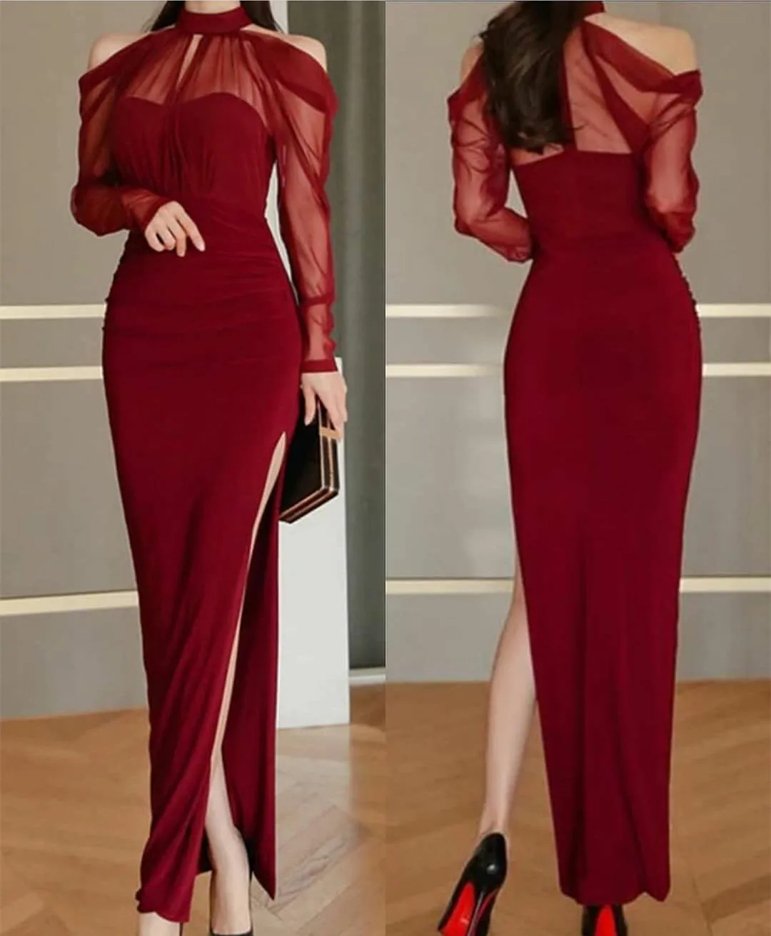 Женское винтажное атласное платье-русалка, длинное Бордовое платье с рукавами, разрезом сбоку