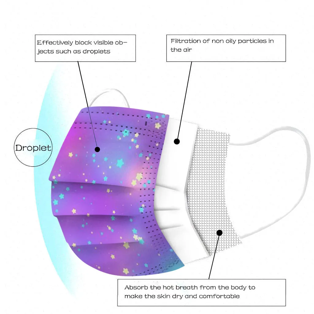 В 3 слоя Нетканая одноразовая маска изготовлена из 3 слоев нетканого материала, Безопасен и безопасен для использования. Дышащий материал и милый Узоры, которые делают его полезным и модным. Специальный 3 слоя из нетканого материала Дизайн, обеспечивает некоторую защиту от пыли, автомобильных выхлопных газов, Пыльца и т. д. эластичная Ушная петля, легко носить и не давит на уши. Маникюрный салон или любые другие области, где может потребоваться защита