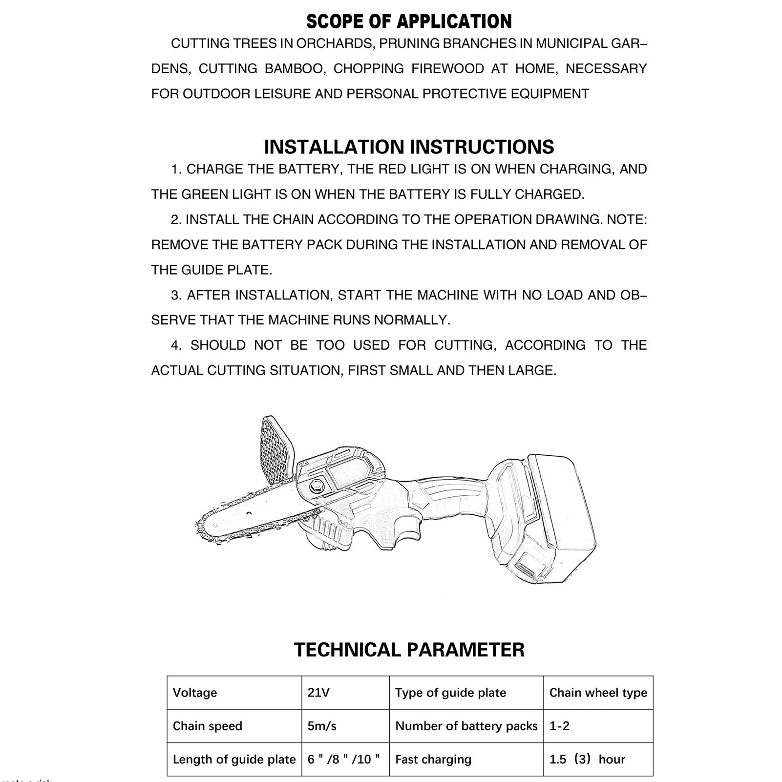 Особенности:Сравните с другими типами бензопилы, эта бензопила имеет правильный размер, а также светильник, так что вы можете держать и использовать его более легко, который используется для большего количества людей.Эргономичный дизайн ручки, использование одной рукой, длительное сжатие не утомят руки.Беспроводной дизайн, легкий и портативный, легко носить и пилить дерево.Опилки были глубоко закалены высокой температурой, с резкими опилками, более износостойкие, гладкие резки.С высокой эффективностью работы, высокой точностью позиционирования, низким уровнем шума, что позволяет вам лучше использовать опыт.С быстрой скоростью резания, что является практичным и низким энергопотреблением, высокой стабильностью и высокой производительностью.Характеристики:Материал: АБС + металлОсновной цвет: зеленыйПитание: 2 * литиевая батарея, 21 в, 1200 мАч (в комплекте)Размер хоста после сборки: 370*110*100 мм/14,6*4,3*3,9 дюймовРазмер направляющей пластины: 185*34*3 мм/7,3*1,3 * 0.1inВес изделия: 1092 г/2,4 фунтаПосылка Размер: 300*120*110 мм/11,8*4,7 * 4.3inПосылка Вес: 1584g / 3.5lb