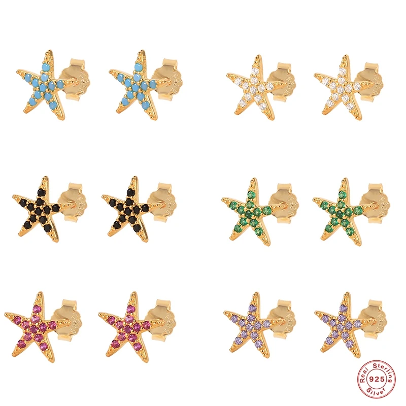 Пирсинг Aretes 925 стерлингового серебра пятиконечная звезда серьги-гвоздики в виде капель с кристаллами в форме женские красочные циркон из нержавеющей стали, мочки уха серьги с застежкой