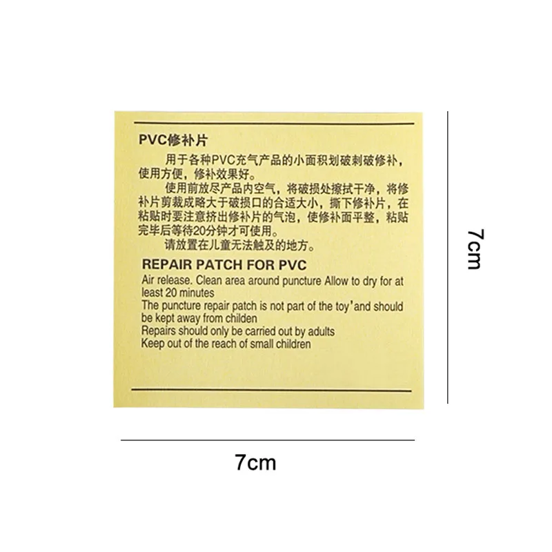 Спецификация: Материал: ПВХ Цвет: прозрачный Размеры состоянии: примерно 7 х 7 см/2,76x2,76 дюймов Количество: 5 шт/10 шт Особенности: 1, для ремонта надувных лодок, подходит для всех типов высокоценных надувных продуктов, таких как воздушные матрасы, надувные лодки, батуты, надувные диваны, плавательные кольца, пляжные шары и т. д. 2, также может быть использован для ремонта или скрепления различных материалов, включая ПВХ, нейлон, холст, искусственная кожа, резина, все виды пластика, металла, стекла и так далее. Шаг ремонта: 1. Очистите поверхность возле прорезей или отверстий и держите их в сухости. 2, снимите бумагу и сразу Прикрепите пластырь к отверстию, полностью закройте ее и нажмите, чтобы она крепко прилипла. 3, ремонт закончен через 20-30 минут, и он полностью затвердеет через 24 часа.