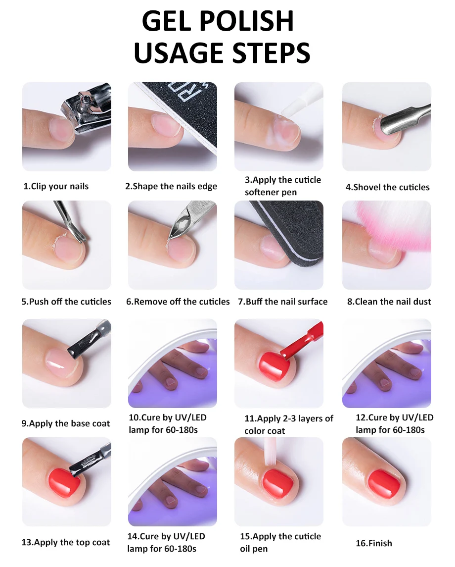 Посылка включает в себя: Цветной Гель-лак * 6, зернистый файл, зернистый буфер, экологический Шинель, светодиодный/УФ-лампа для ногтей, Накладка для удаления * 20, сепаратор для ногтей, вилка для кутикулы, толкатель для кутикулы, ножницы для кутикулы, наконечники * 2, накладные ногти * 2, верхнее покрытие, Базовое покрытие[Больше комплектов на ваш выбор]