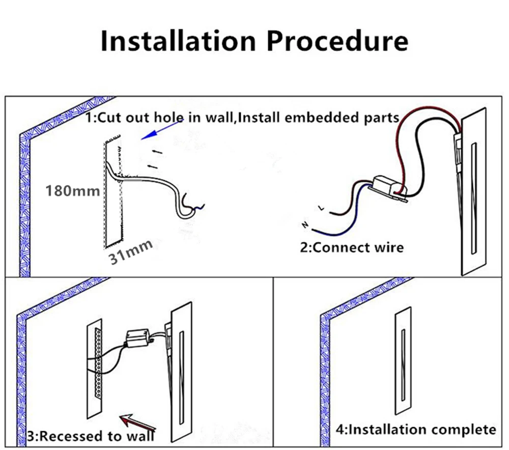 Мощность: 3 ВтВходное напряжение: 85-265 вЦветовая температура: WW(3000K),NW(4000k),CW(6000K)Светильник щения: OSRAMСветовой материал корпуса: алюминийСрок службы: 40000 чЦвет абажура: серебристый, белый, черныйОтверстие: д180*ш31*в45 ммCRI:≥ 80Водонепроницаемость: в помещении IP20Применение: лестницы, подножки, коридор, лестница, лестница, дом, гостиница, дорожка
