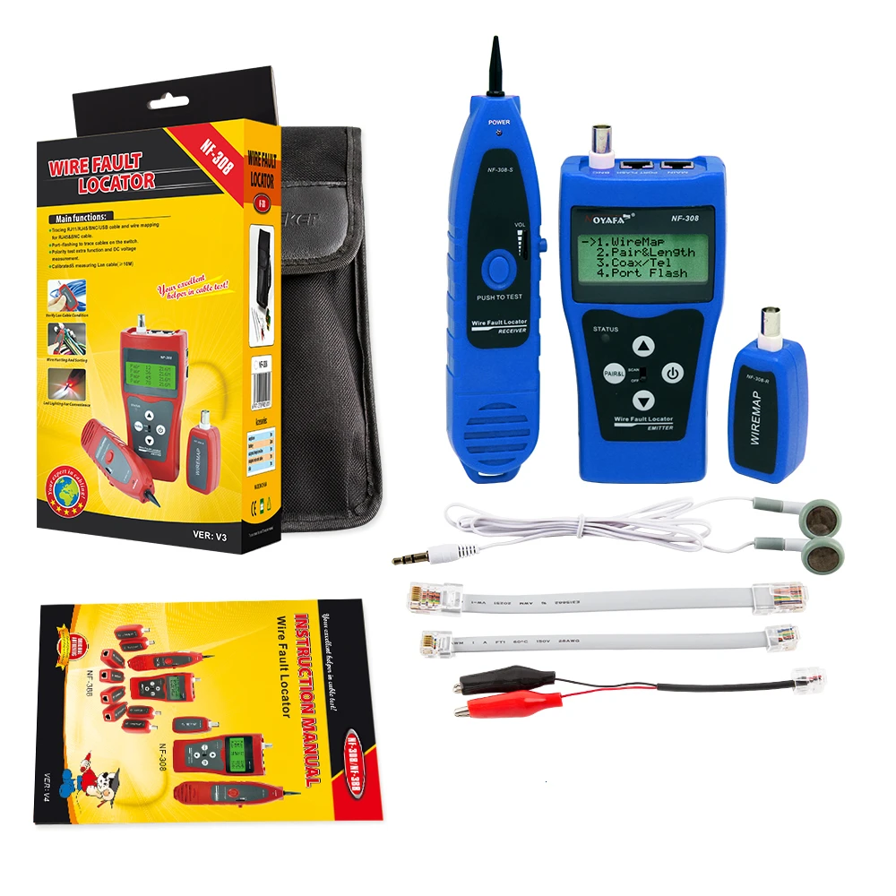 Особенности:1. Непосредственно Охота 5E, 6E, телефонный провод, коаксиальный кабель, USB кабель и другие кабели.2. Мигание концентратора для определения местоположения сетевого порта через мигающий светильник порта на ступице/переключателе.3. Проверьте ошибку проводки в 5E, 6E, коаксиальный кабель, такой как открытая цепь, короткое замыкание, перемычка, обратное соединение. 4. Обнаружите ошибку подключения или подключения.5. Измерьте длину кабеля до 1000 м и найдите точку поломки.6. Полярности Функция измерения напряжения постоянного тока (0,5-60 V)7. Память и память для калибровки данных.8. Автоматическое отключение с задержкой времени и функция оповещения о низком заряде батареи.Технические показатели:Характеристики передатчика NF-308Indictor LCD 53x25 мм, с задний светильникЧастота тона 225 ГцМакс. Расстояние передачи 2 кмМакс. Расстояние карты кабеля 1 кмМакс. Рабочий ток менее 70 мАРежим тона 2 тона регулируемыйСовместимые разъемы RJ11,RJ45,Coacial, USBМакс. Напряжение сигнала 15Vp-pВыбор функций: 3 кнопки положения и 1 выключатель питанияФункция и неисправности ЖК-дисплея ЖК-дисплей (карта, тон, короткий, без адаптера, низкий аккумулятор)Индикация карты кабеля LCD (#1-#8)Экранированная Индикация LCD ( #9)Защита напряжения AC 60V/DC 42VТип батареи DC9.0V(NEDA 1604/6F22 DC9V x 1 шт)Размеры (lxwx) 185x80x32ммХарактеристики приемника NF-308Частота 225 кГцМаксимальный рабочий ток менее 70 мАДомкрат 1Светодиодный светильник 2Тип батареи DC9.0V(NEDA 1604/6F22 DC9V) x1pcРазмеры (Д х Ш х Г) 218x46x29 ммNF-308 Технические характеристики пульта дистанционного управленияСовместимые разъемы RJ45, BNCРазмер (lxwx) 107x30x24ммВнимание:1. Не подключайте высоковольтные линии, чтобы избежать вырывания машины.2. Поместите в нужное место, чтобы не повредить других, из-за острых деталей.3. Подключите кабель к правому порту.4. Прочитайте руководство пользователя перед использованием.Посылка включает:1X NF-308 проводный трекер (аккумулятор не входит в комплект)