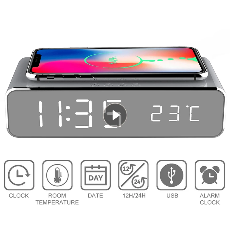 Часы-Будильник цифровые, с беспроводным зарядным устройством и дисплеем