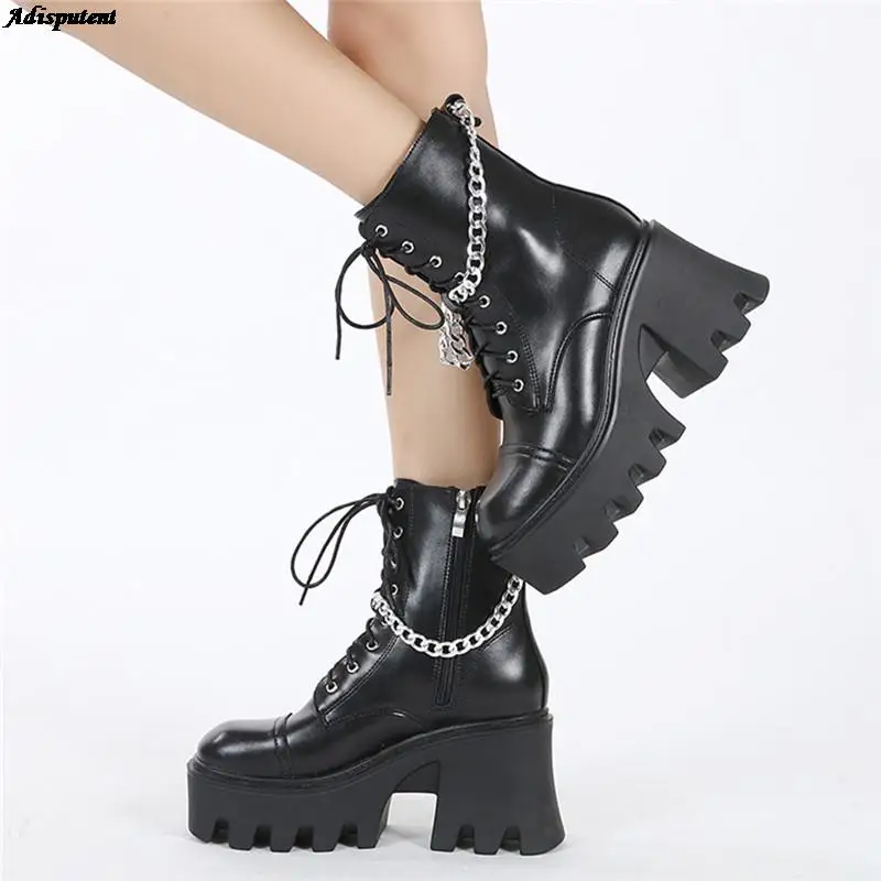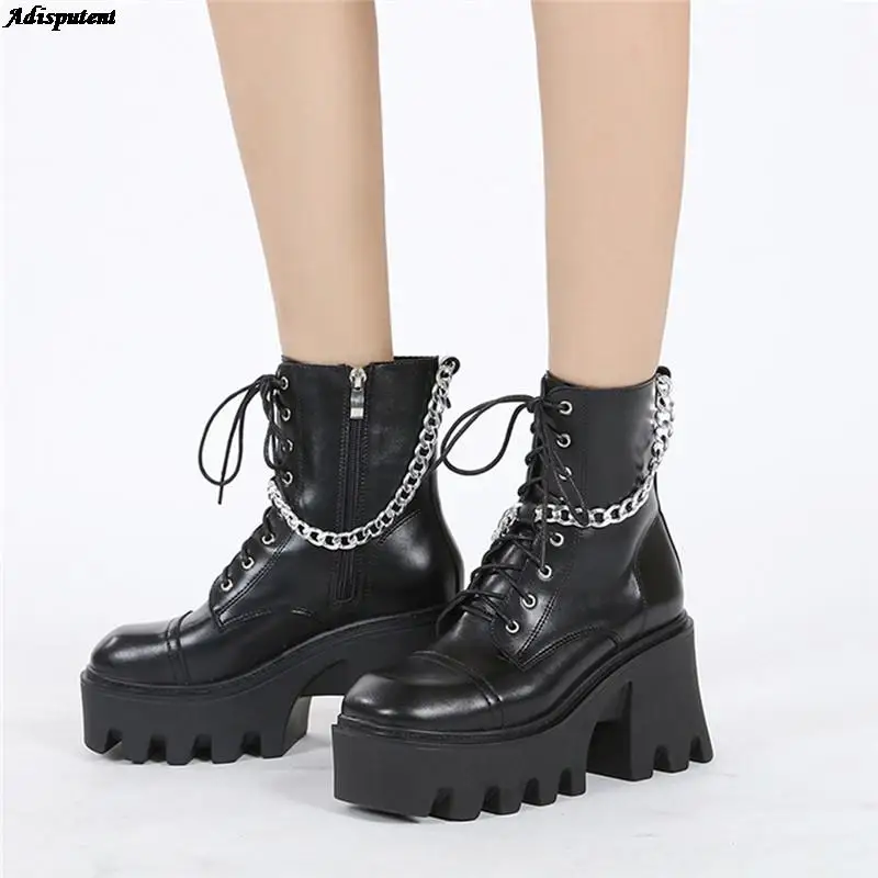 Ботильоны женские на платформе и квадратном каблуке, соблазнительные полусапожки на массивной подошве, на шнуровке, на молнии, с цепочкой, в стиле панк, боевые ботинки