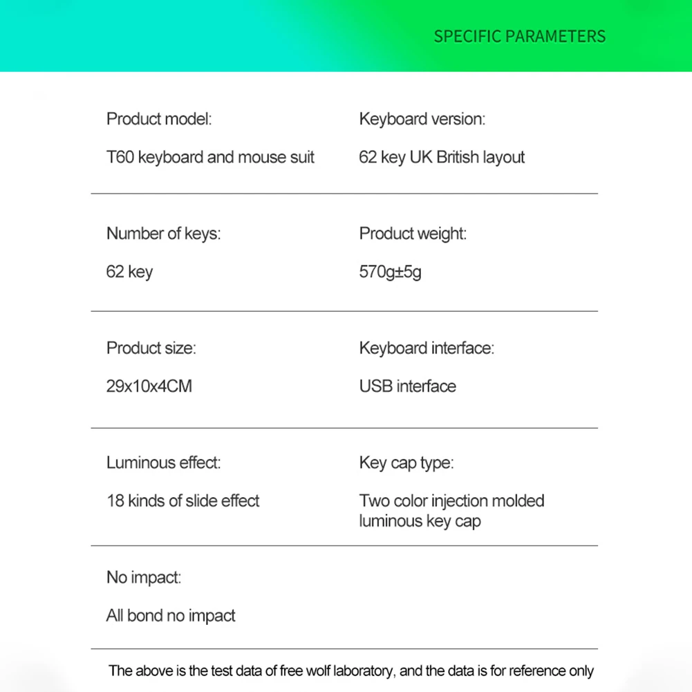 T60 62 клавиши NKRO 18 цветов с подсветкой USB C Проводная клавиатура игровая компьютерная офисная механическая клавиатура для геймерского ПК ноутбукаХарактеристика:1. Многофункциональное применение, 60% компактная механическая клавиатура стандартного размера.2. Механическая шахтная офисная игра долговечна.3. Двухцветные литые колпачки под давлением, нежная текстура, износостойкие и антиударные.4. Расположение 62 клавиш компактное и маленькое.5. Встроенный светильник памяти.6. Кабель интерфейса Type-C, plug and play, легко разбирается.7. 18 видов режимов подсветки, магический эффект освещения.Спецификация:Название: 62-Механическая игровая клавиатураМодель: T60Материал: АБС-пластикЦвет: черный, серый, белый, синий, белый, розовыйПодшипник: зеленый валКоличество клавиш: 62 клавишиОпрокидывание: у всех клавиш нет опрокидыванияСветовые эффекты освещения: 18 видов магических световых эффектовТип ключа: двухцветная светящаяся КепкаМетод связи: USB-C ссылкаРазмер упаковки: 347x112x4 7 мм/13.66x4.41x1.85inПосылка Вес: 680 гПримечание:В связи с различиями мониторов и эффектами освещения реальный цвет товара может немного отличаться от цвета на фотографиях. Спасибо!Возможны отклонения в 1-2 см вследствие измерений вручную.