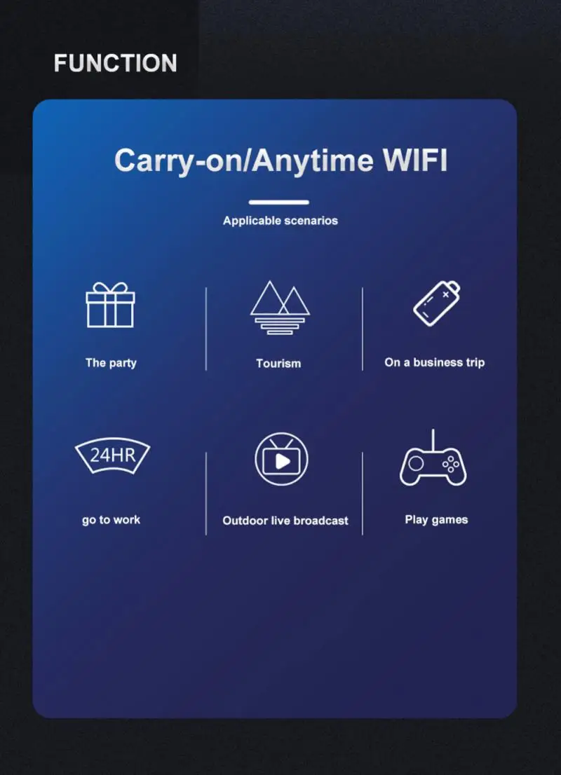 Продукт в основном разработан для SOHO, пользователей транспортных средств, деловых людей и путешественников на открытом воздухе, поддерживает одновременно до 10 пользователей, низкое энергопотребление; Стильный, компактный и портативный позволит вам наслаждаться высокоскоростным интернетом в любое время и в любом месте.