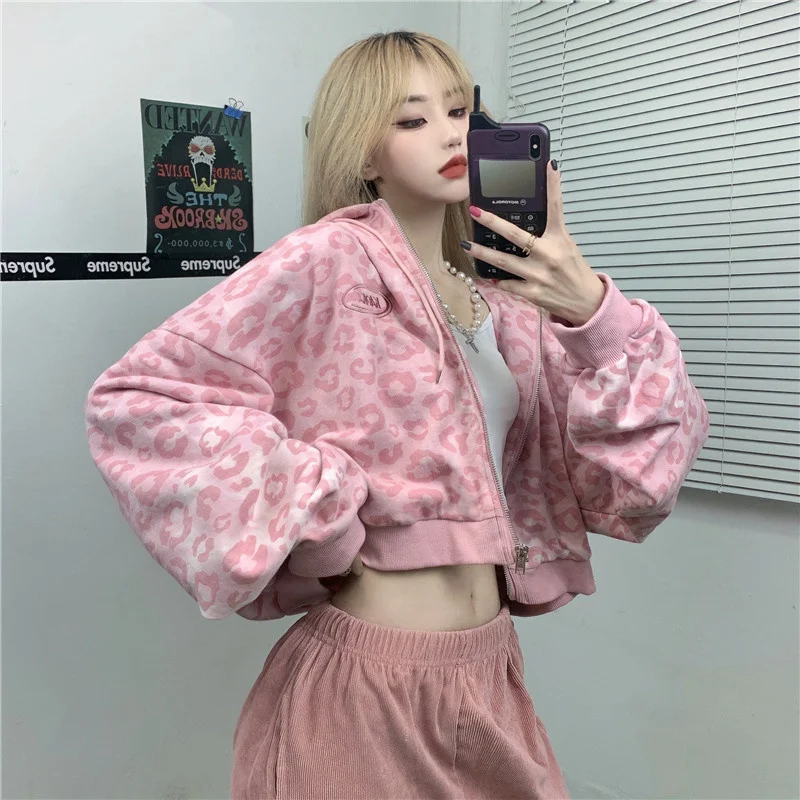 Женский свитшот с длинным рукавом, пикантный короткий худи с леопардовым принтом, с вышивкой надписью, на молнии, одежда в стиле хип-хоп, на осень