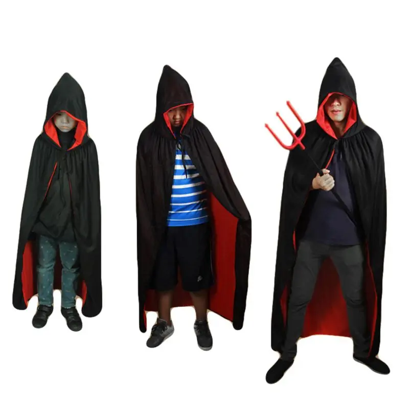 Плащ для Хэллоуина доступен в двух цветах: однослойный черный и двухслойный черный + красный двусторонний плащ с капюшоном.