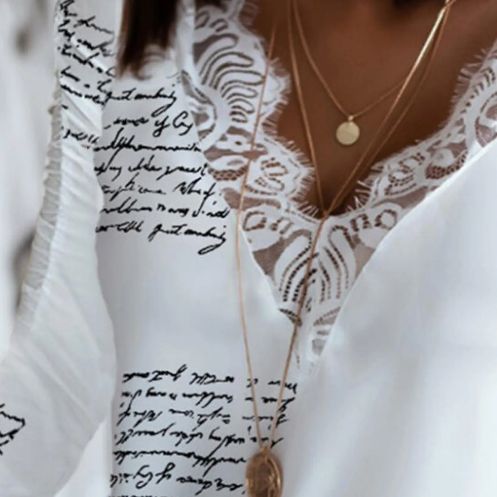 Женская кружевная блузка с буквенным принтом, зимняя Модная Повседневная Дамская одежда с V-образным вырезом и длинным рукавом, топы в западном стиле для девушек