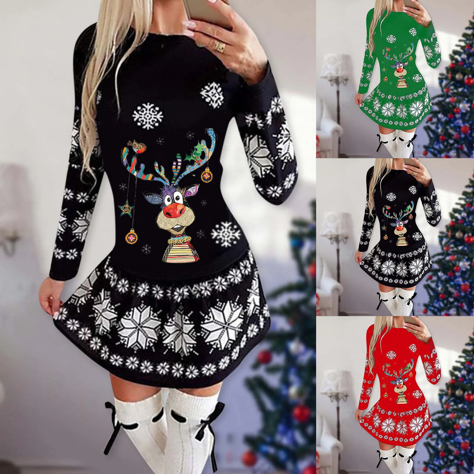 Женские платья 2022, модный Рождественский костюм с принтом оленя и лося, повседневное сексуальное праздвечерние чное платье большого размера с длинным рукавом на осень и зиму