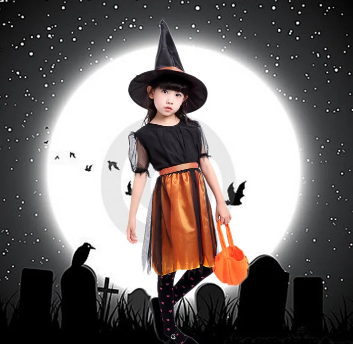 Детский костюм ведьмы на Хэллоуин для девочек, наряд для подростков и маленьких девочек, платье ведьмы, комплект одежды, колготки, шляпа, сумка с тыквой