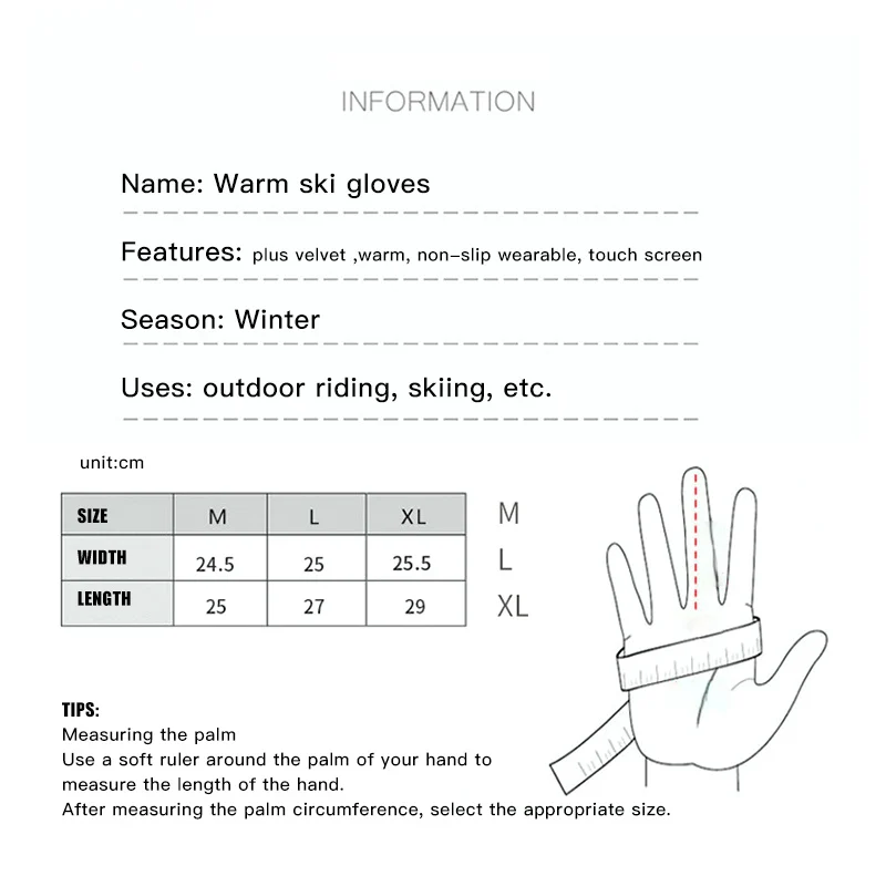 L подходит для окружности ладони 24-25 см, длина 27 см.XL подходит для окружности ладони 25-26 см, длина 29 см.Посылка: