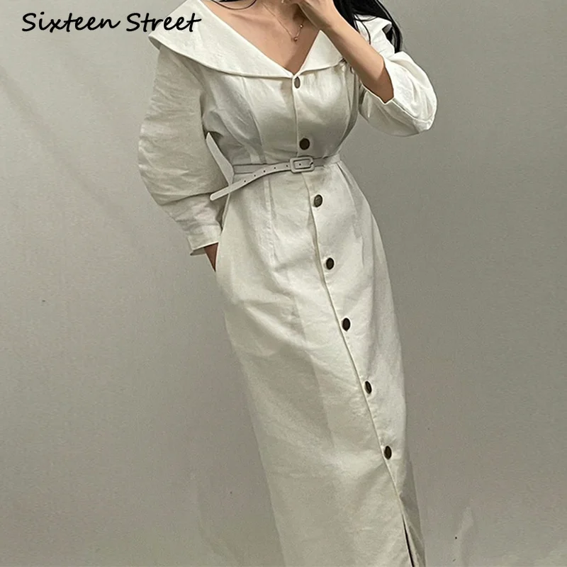 Женское однобортное Платье макси с отложным воротником, модная одежда в Корейском стиле, пикантное винтажное платье с длинным рукавом