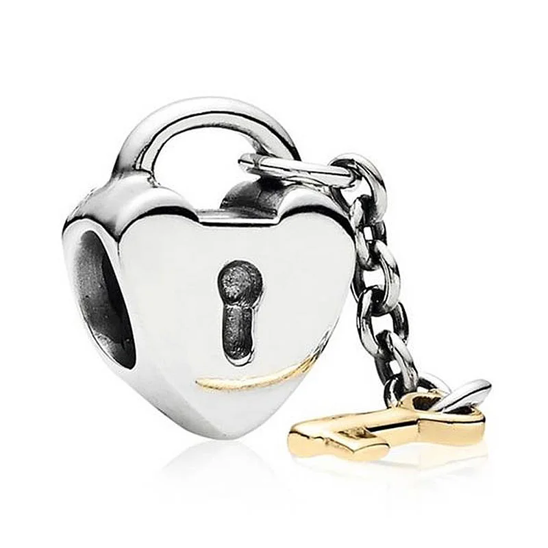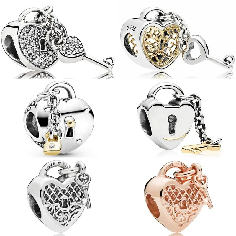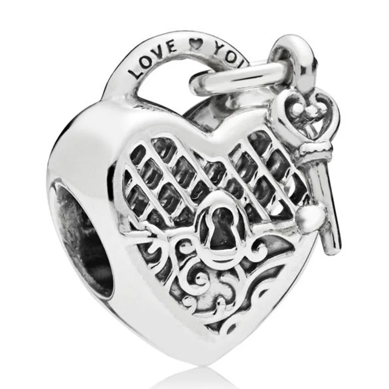 Оригинальный новый амулет S925, ажурный замок, замок в форме сердца и ключ с кристаллом, подвеска из бисера, подходит для браслета Pandora, ювелирные изделия сделай сам