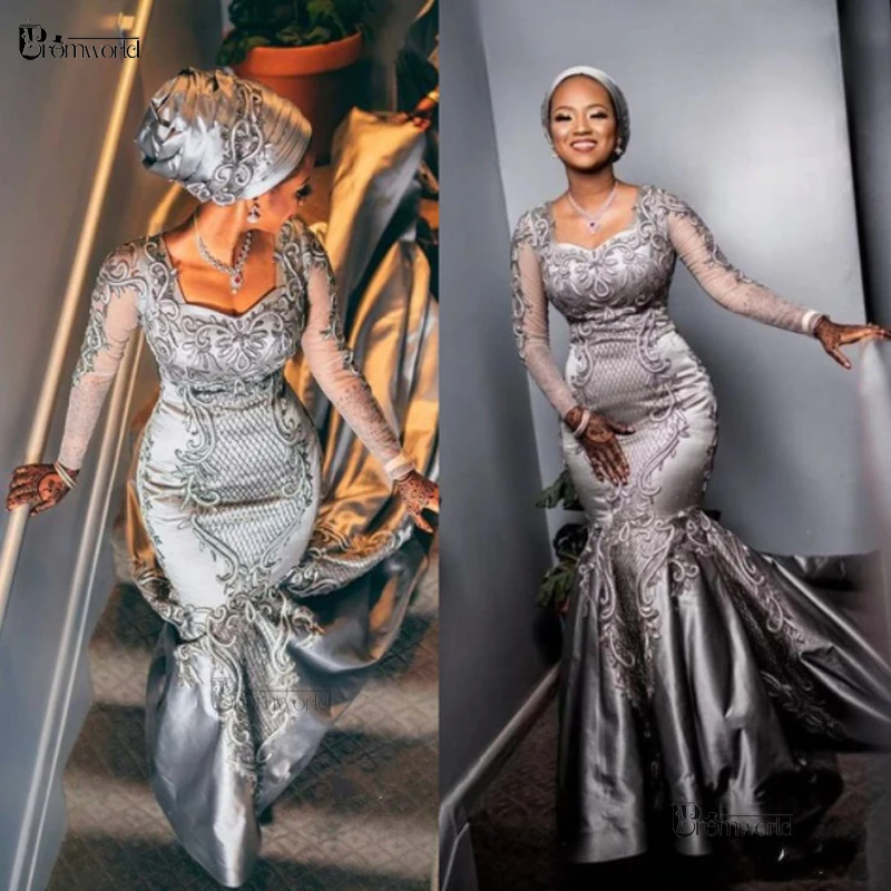 Вечерние платья с длинным рукавом, серые кружевные платья, украшенн...
