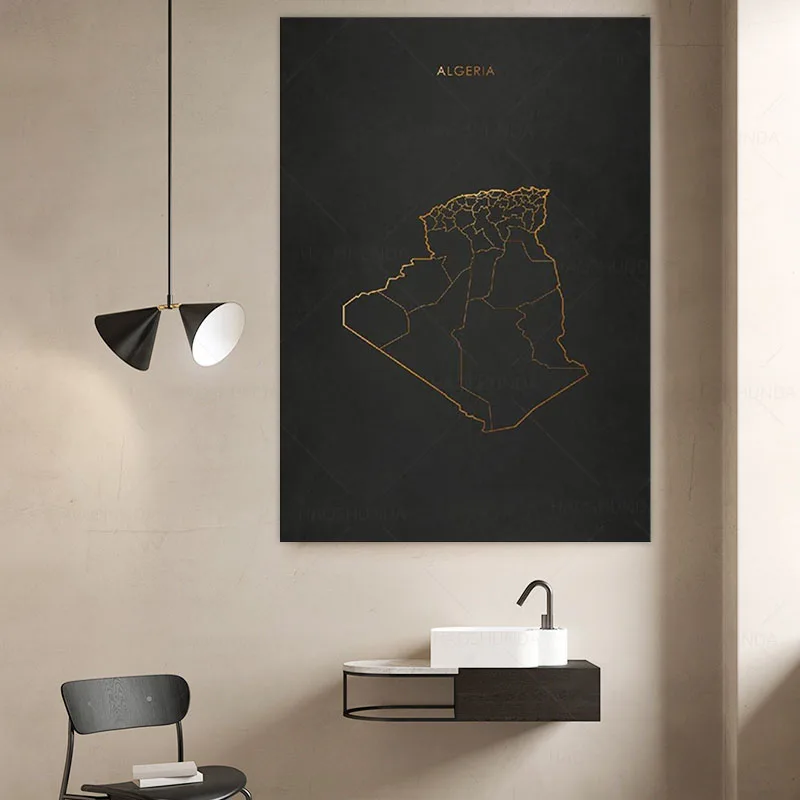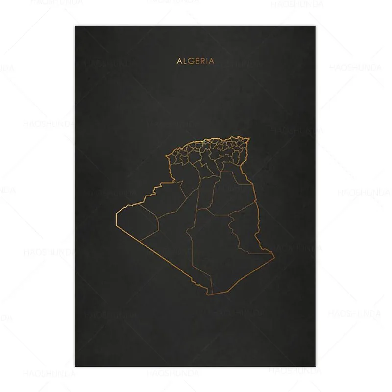 Золотая линия, черная карта Алжира, холст, настенный художественный принт, современный плакат, настенные картины для гостиной, домашний декор, рамка