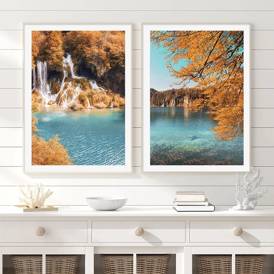 Картина на холсте с изображением гор, водопада, леса, осенних листь...