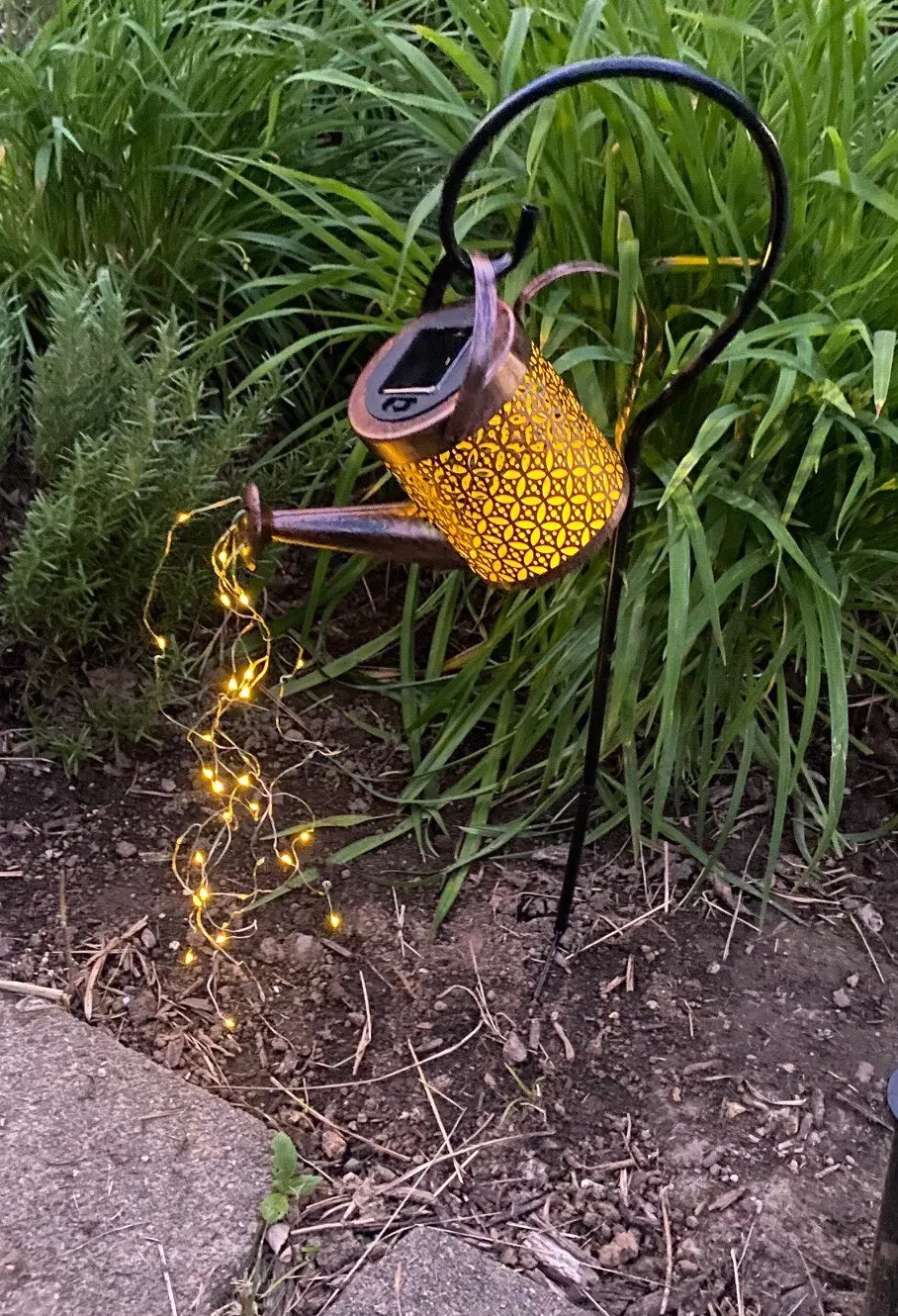Это приятное дополнение к нашему саду уже с несколькими фонариками. Мы разместили это в отдельной зоне, чтобы он мог выделиться самостоятельно, и мы рады, что мы сделали это, потому что это было забавно, когда маленькие огни сверкают. Мы уже получили комплименты от наших друзей через несколько дней после создания этого. Легко собрать. На самом деле, вы просто Подключите подставку, и вы довольно много сделали. Остальное легко разобраться-Разгладьте маленькие гирлянды и поместите солнечную панель в верхней части чайника. Повесьте чайник, дайте ему зарядить и посмотрите, как он загорается ночью. Похоже, что вода вытекла из чайника. Довольно крутой. У нас уже было несколько гроз и сильный ливень. До сих пор это держится.