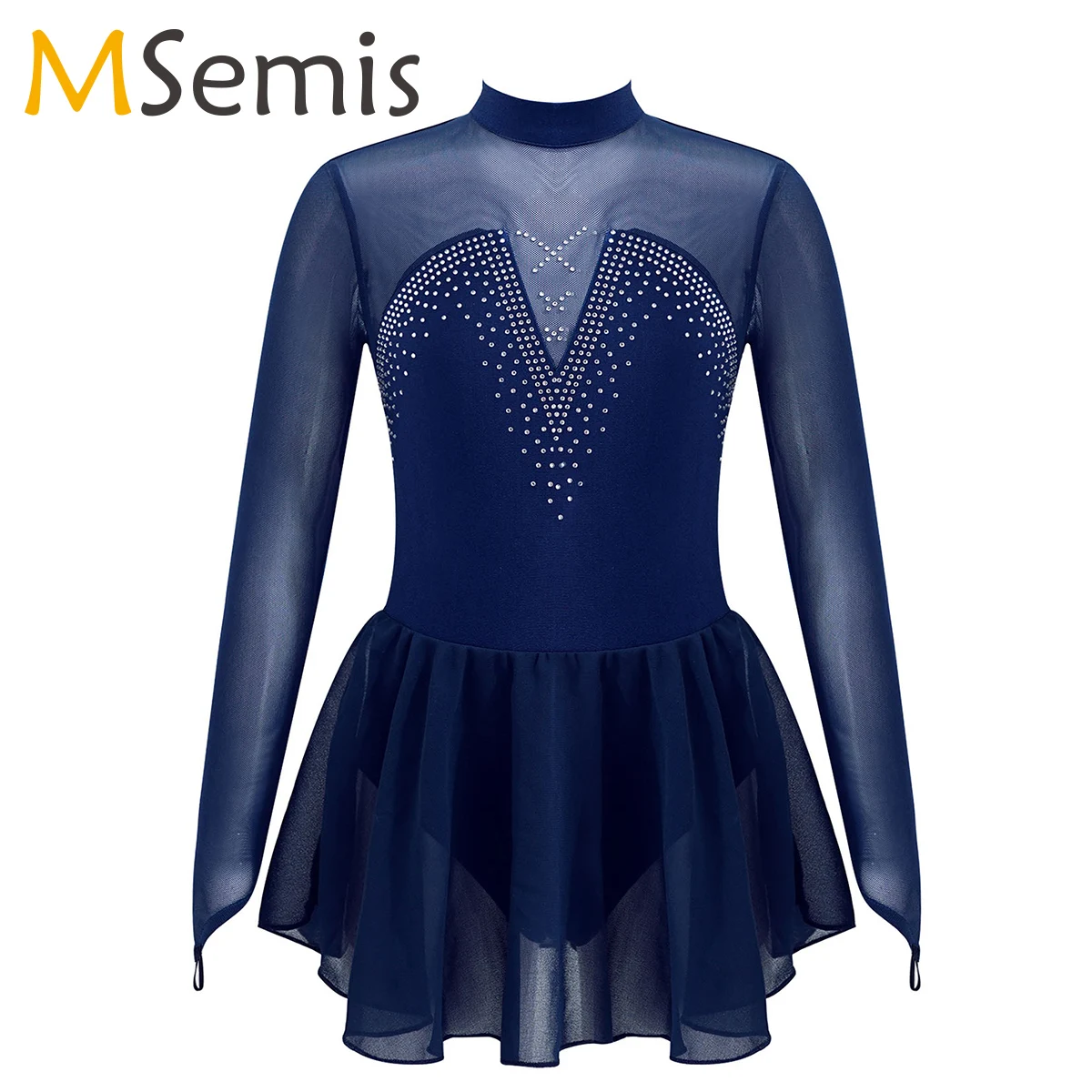 # Детей от 6 до 14 лет, для маленькой девочки стильные Катание на коньках футболка с круглым вырезом, длинными рукавами и открытой спиной к требованиям заказчика; Сверкающие стразы из сетчатой ткани для катания на коньках для танцевальное платье, гимнастический купальник