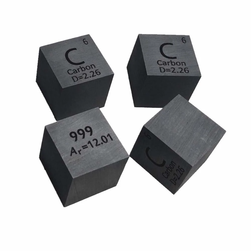 Каждый куб выгравирован символом элемента, атомным номером, относительной атомной массой и чистотой.