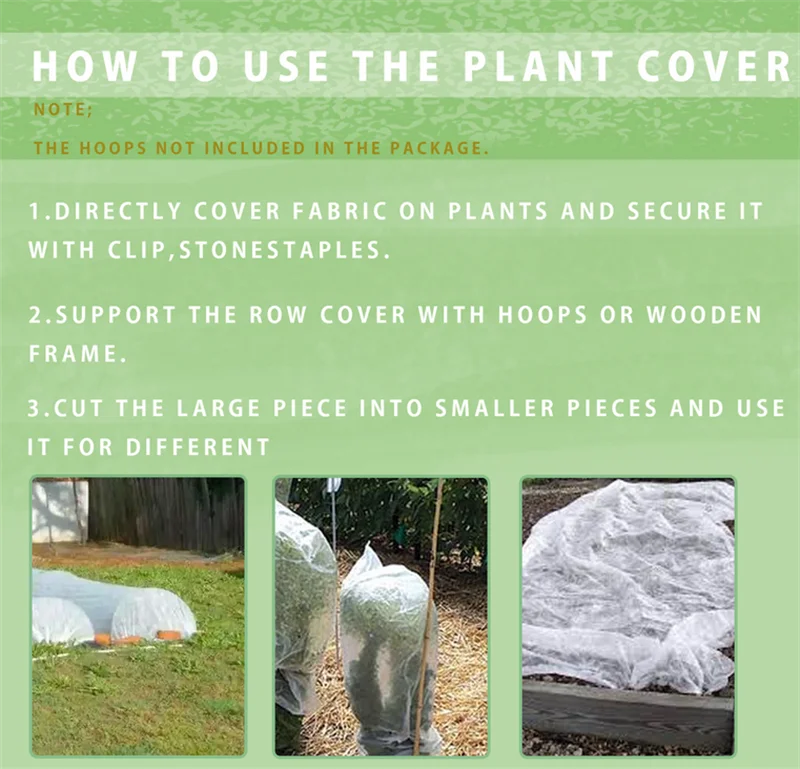 Легко установить: Этот открытый растительный чехол может быть помещен непосредственно на сельскохозяйственные культуры и соломенные шляпы и закреплен с грунтом, камнями, зажимами или другими тяжелыми предметами. После нагревания его легко установить и снять.