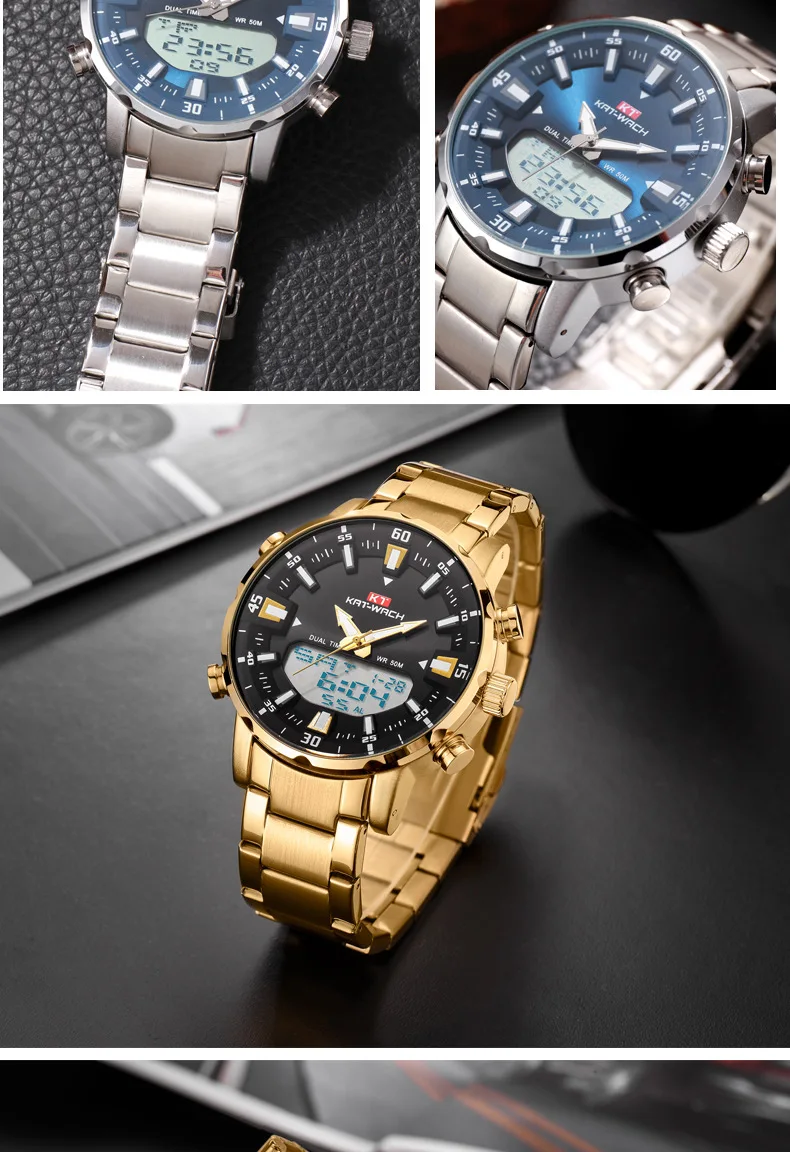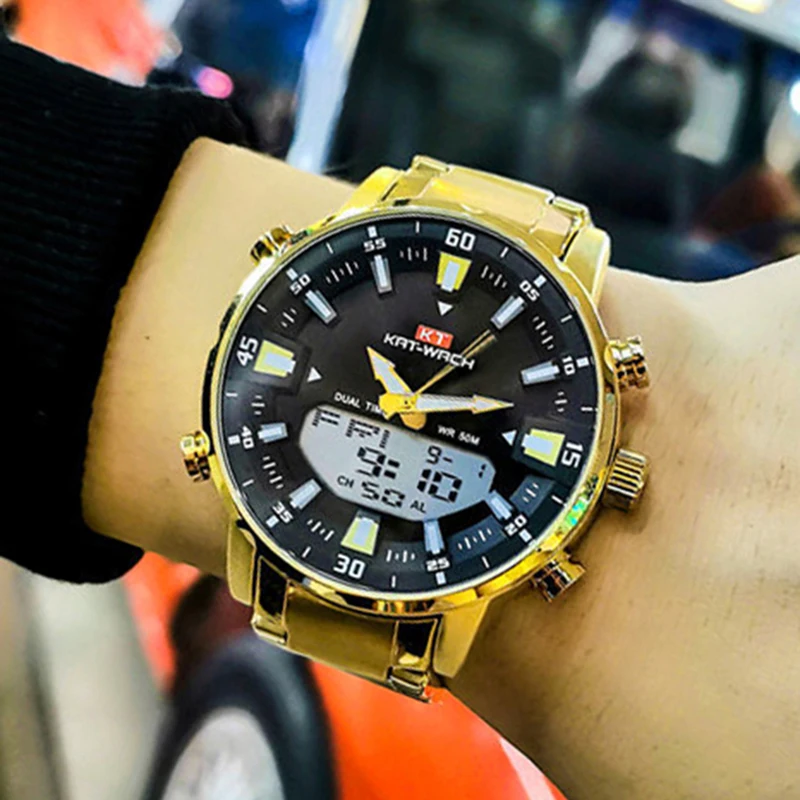 Часы наручные мужские цифровые, брендовые водонепроницаемые спортивные светодиодсветодиодный стальные военные кварцевые, с большим циферблатом, золотистого цвета, 50 м