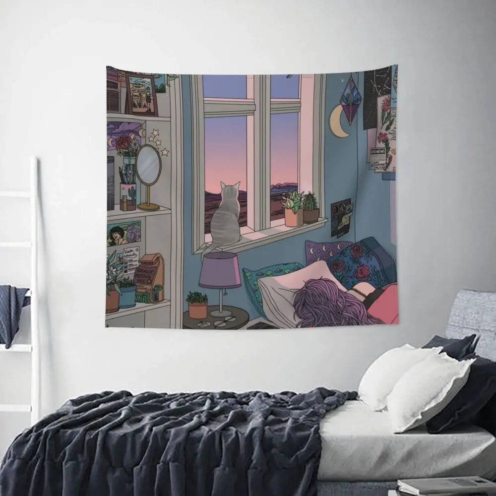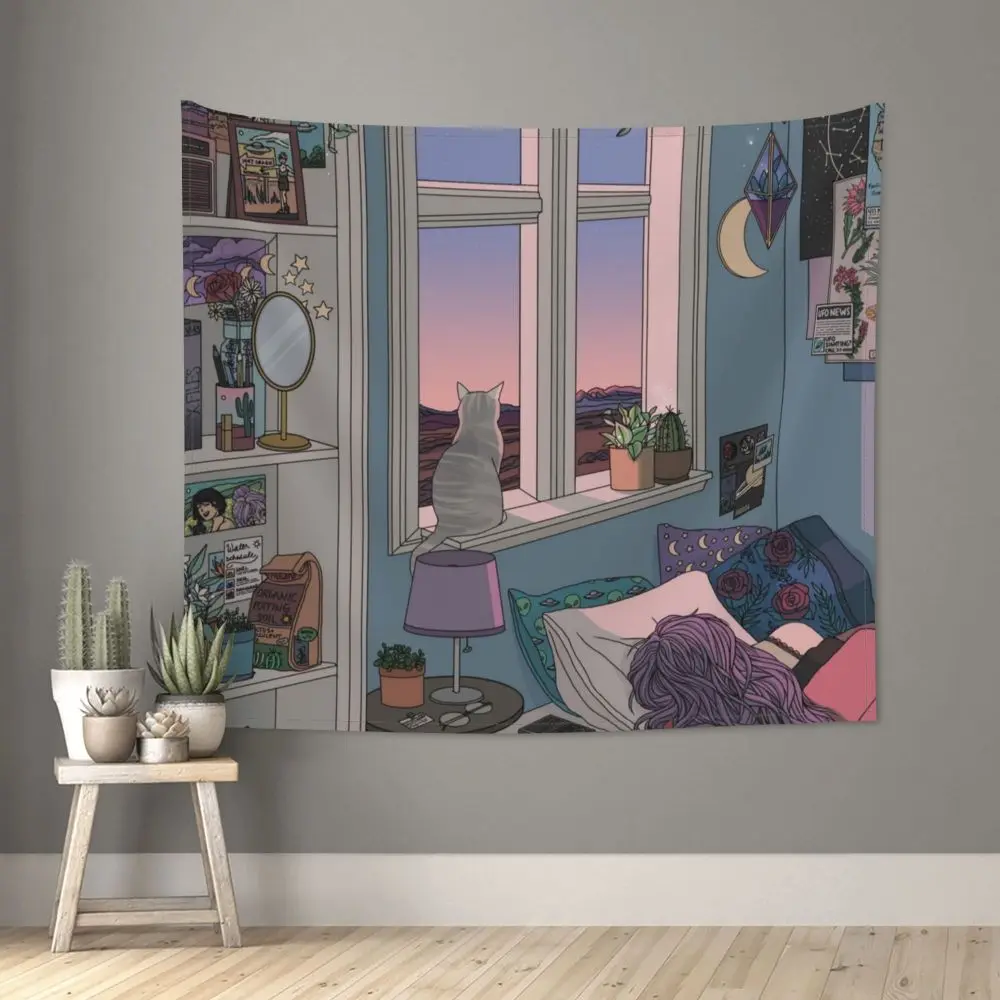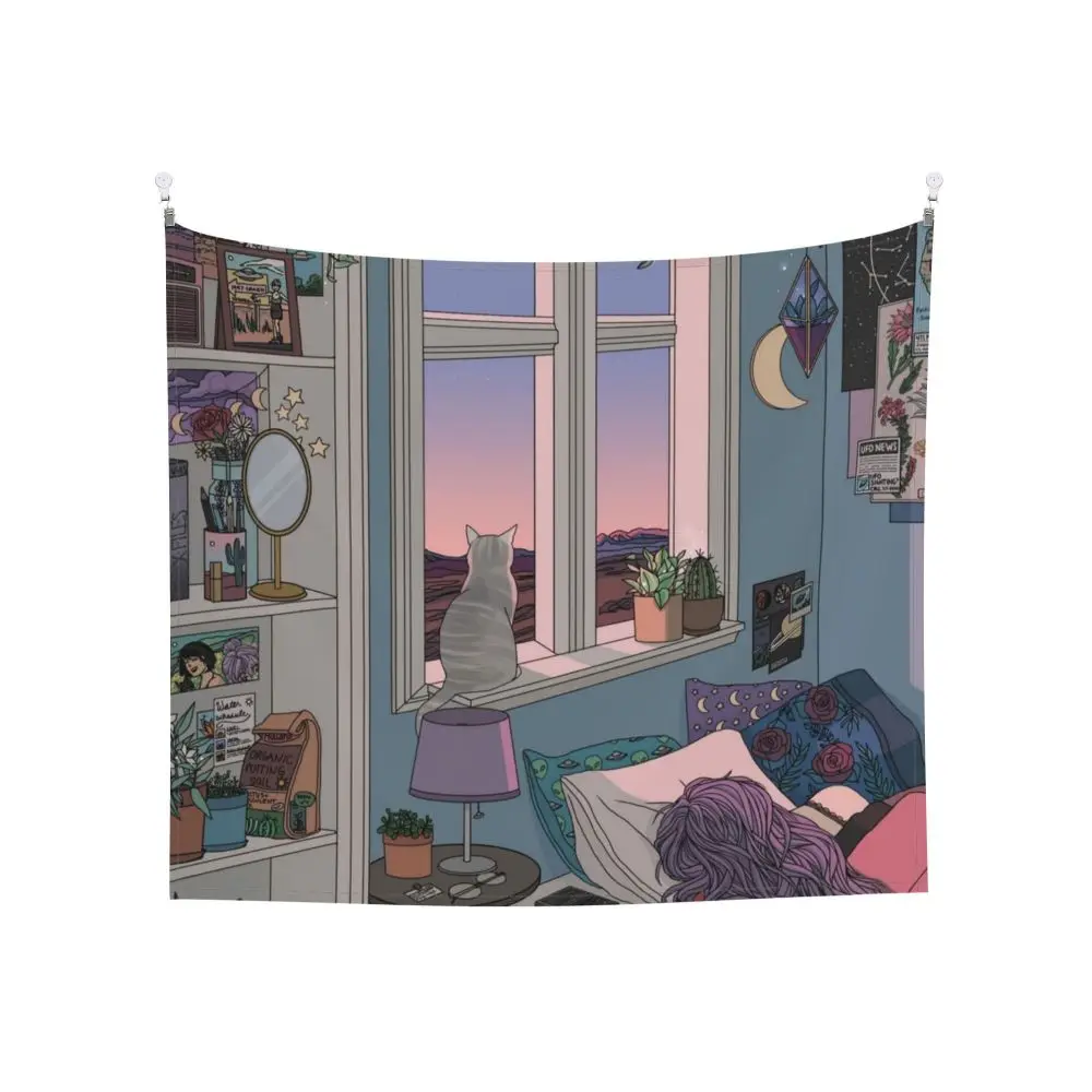 Настенный большой гобелен Morning Cat And гобелены для девочек, милый аниме богемный декор, домашний декор для гостиной, спальни