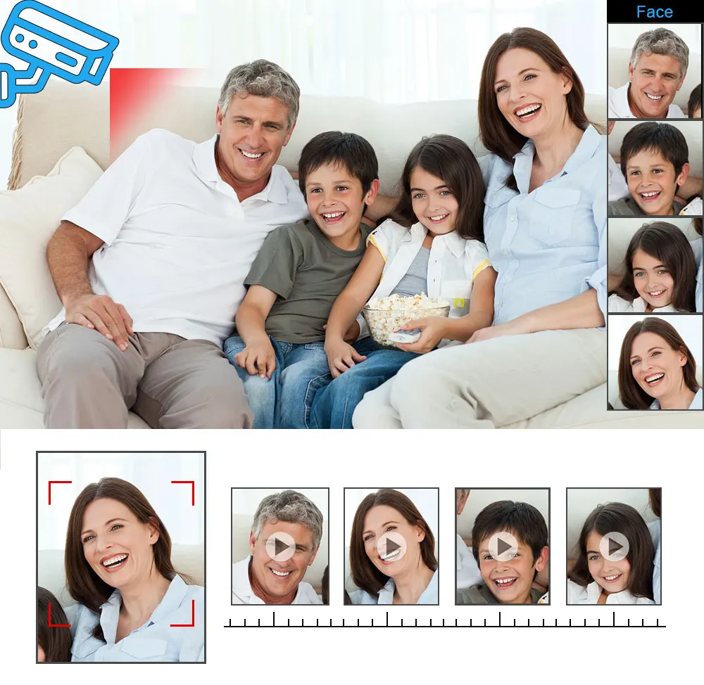 Обнаружение лица, воспроизведение лица и запись лица; Быстрое снятие изображений лица и быстрое воспроизведение видео лица; Распознавание лица: автоматическое снятие изображений лица; Интеллектуальное воспроизведение лица: интеллектуальное воспроизведение видео лица, экономия времени, не пропустите все детали.