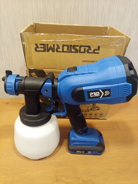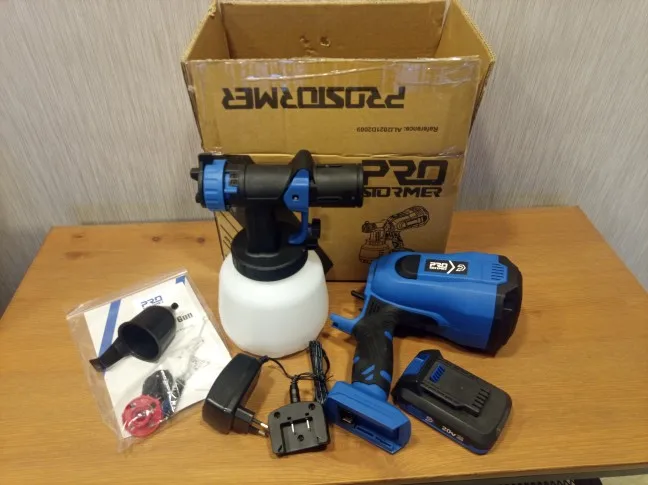 Наконец то дождались аккумуляторный краскопульт Простормер. 2 года пользуемся сетевым Простормер 600W, мощности всегда хватало. Аккумуляторный по первым ощущениям немного слабее, но для лёгких красок, тонировки, грунтовки и прочих лёгких жидкостей вполне подойдёт. Также можно использовать и для обработки и покраски деревьев в саду. Время работы аккумулятора не проверяли. Так как есть большой запас аккумуляторов 20V, в нашем случае это не критично. В комплекте 4 сопла разного размера. По ощущениям, отличный краскопульт