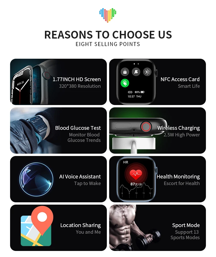1,77 дюймов HD Экран/NFC карта доступа/для измерения уровня глюкозы в крови Тесты/Беспроводной зарядки/AI голосовой помощник/мониторинг здоровья/местоположение/спортивный режим
