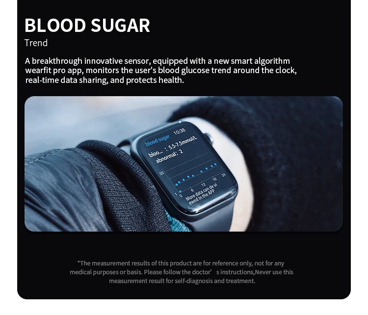 Революционный Инновационный Датчик, оснащенный новым умным алгоритмом wearfit pro app, отслеживает тренд глюкозы в крови пользователя круглосуточно, обмен данными в реальном времени и защищает здоровье
