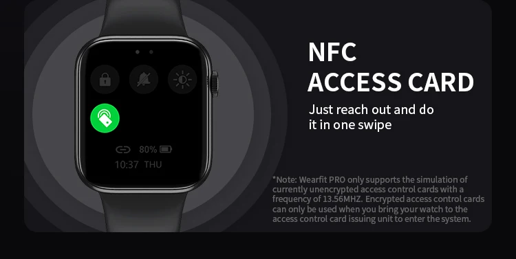 Примечание: Wearfit PRO поддерживает только симуляцию незашифрованных карт контроля доступа с частотой 13,56 Гц. Зашифрованные карты контроля доступа могут использоваться только тогда, когда вы доставляете часы к блоку управления доступом для входа в систему.