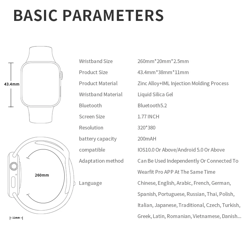 * Модель: LETIKE HW57 Pro* Экран: 1,77 Inch-квадратный Экран* Разрешение экрана: разрешение 320*380* Сенсорный экран: сенсорный экран* Аккумулятор: 200 мАч* Версия Bluetooth: Bluetooth 5,2* Совместимость: IOS 10,0 или выше/Android 5,0 или выше.