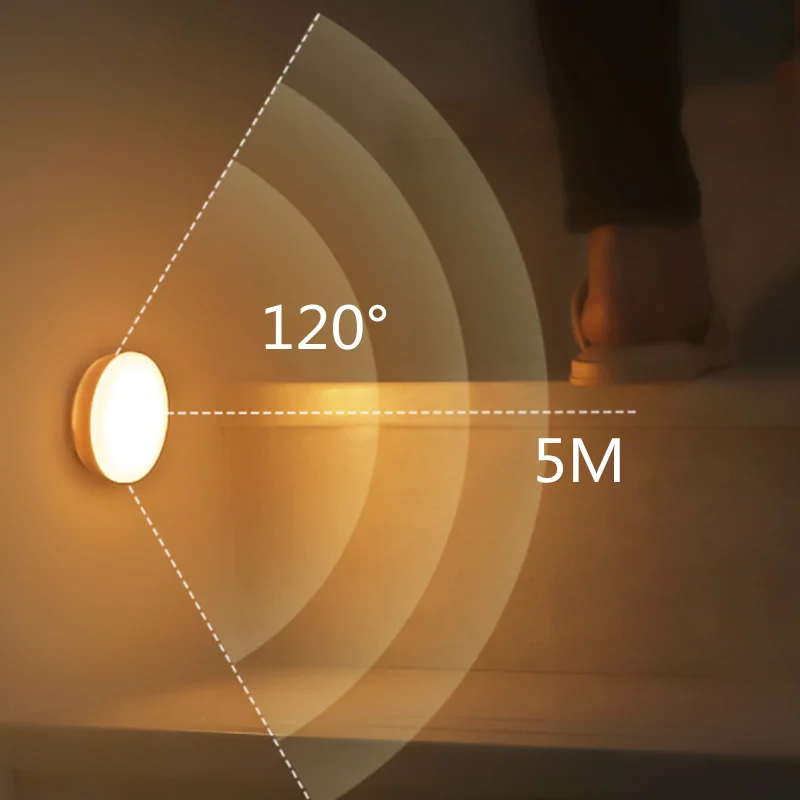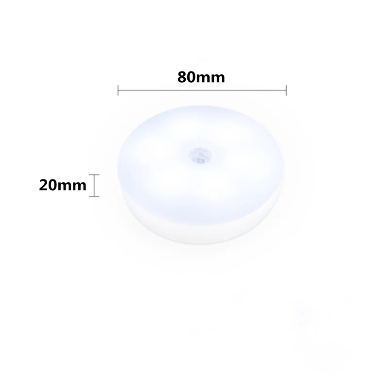 Расстояние срабатывания: около 3-5 мУгол срабатывания: около 120 °Режим PIR датчика движенияКогда кто-то приходит, свет засветильник рается. Через 20 секунд после того, как кто-то ушел светильник погас. Используется для Полночного освещения, подсветки напоминаний о входе, кухонь, шкафов, шкафов.Перезаряжаемая батарея400 мАч: подсветка используется для 4 часа.600 мАч: подсветка используется для 7 часов.Форма: круглаяЦвет светильник: белый/теплый белый/двухцветныйМощность: движениеНапряжение: 5 В