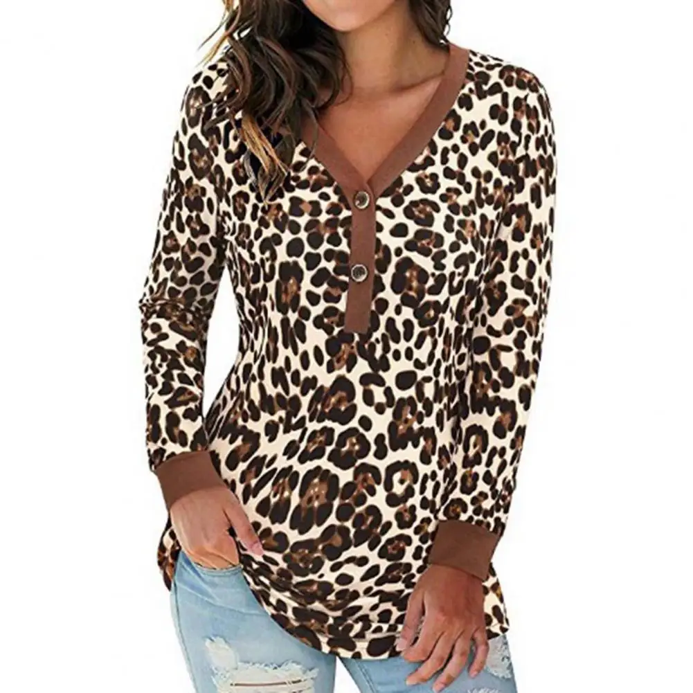 Блузка женская однотонная с леопардовым принтом, повседневный Топ с длинным рукавом, свободная туника с V-образным вырезом, пуловер, уличная одежда