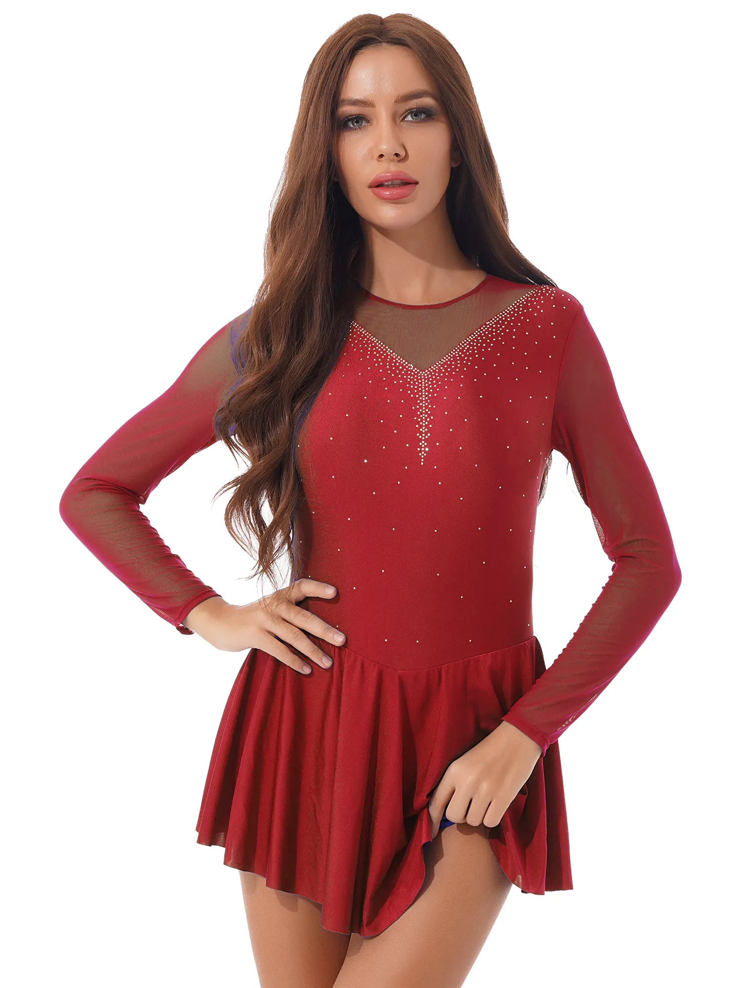 Особенности: Женские блестящие, со стразами платье для танцев Прозрачное нижнее белье Из Сетчатой Ткани в стиле пэчворк Фигурное катание костюм для домашних животных. Изготовлено из мягкой ткани, дышащей, приятной для кожи, удобной на ощупь и в носке, позволяет вам чувствовать себя хорошо. Прозрачное нижнее белье из сетчатой ткани в стиле пэчворк, блестящие стразы, Замочная скважина дизайн на спине. Купальник с круглым вырезом и длинными рукавами, украшенный юбкой с рюшами, сочетается с танцевальным платьем. Подходит для выступлений на сцене, гимнастики, фигурного катания, соревнований по танцам, занятий танцами и т. д.